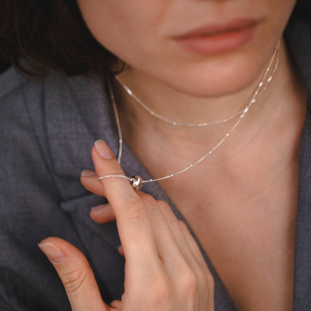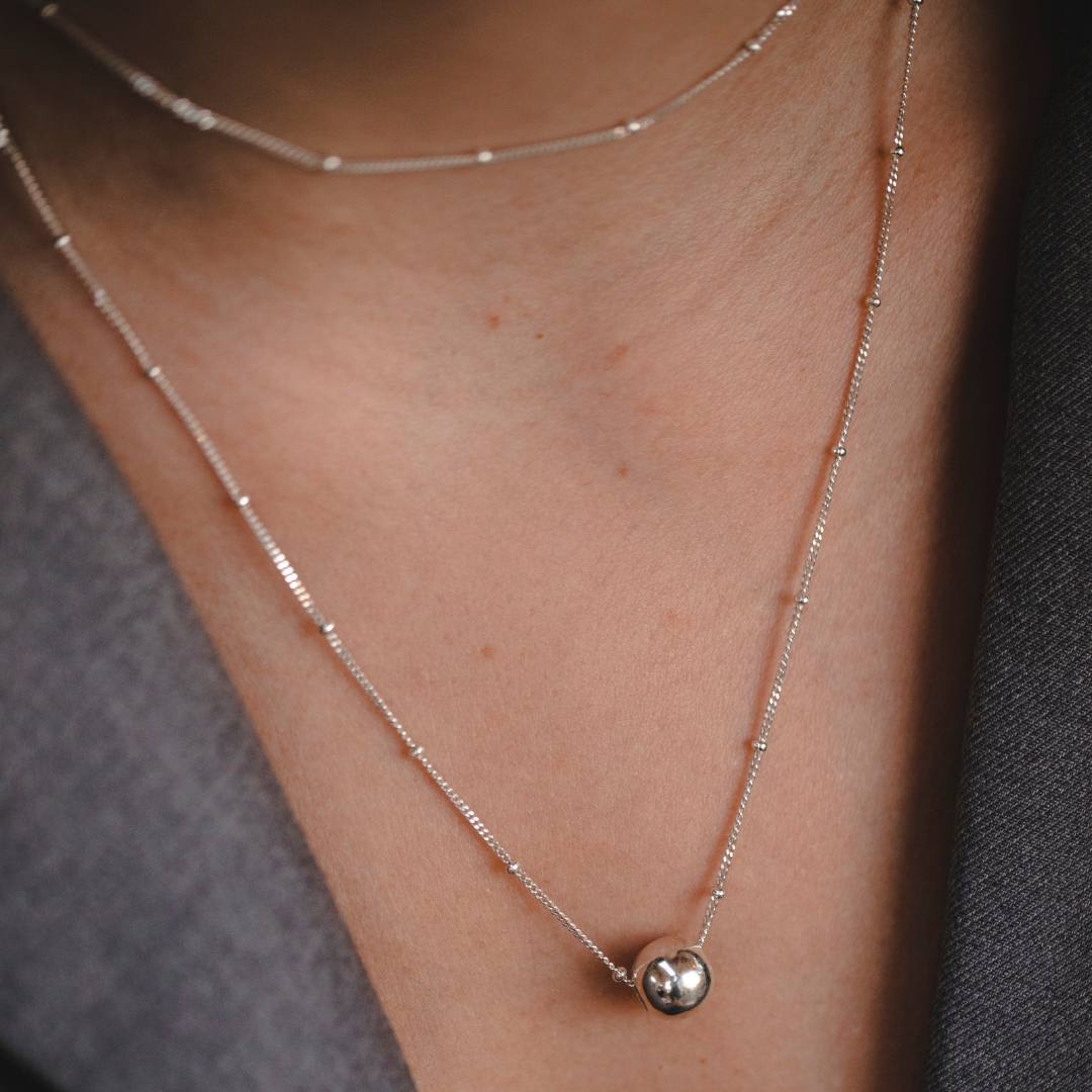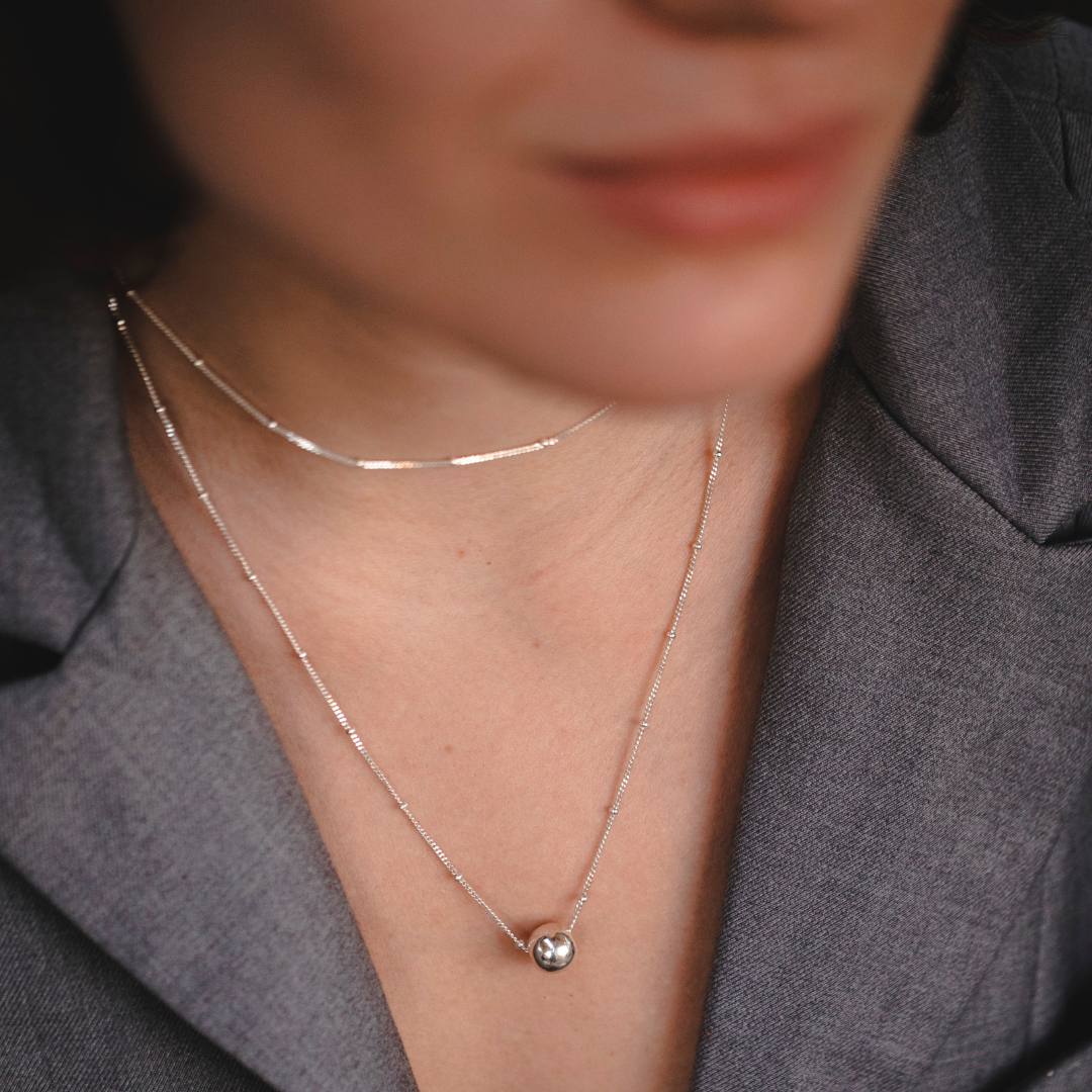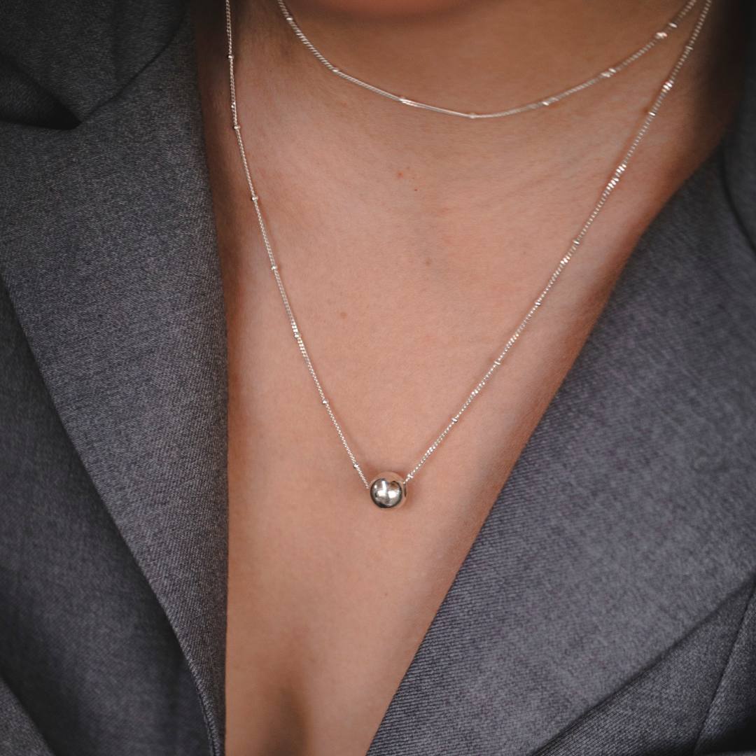 שתי שכבות של שרשרת כסף עדינה של נפגשות עם תליון עגול בגימור מבריק שמוסיף טאצ’ מיוחד ומלא אופי.